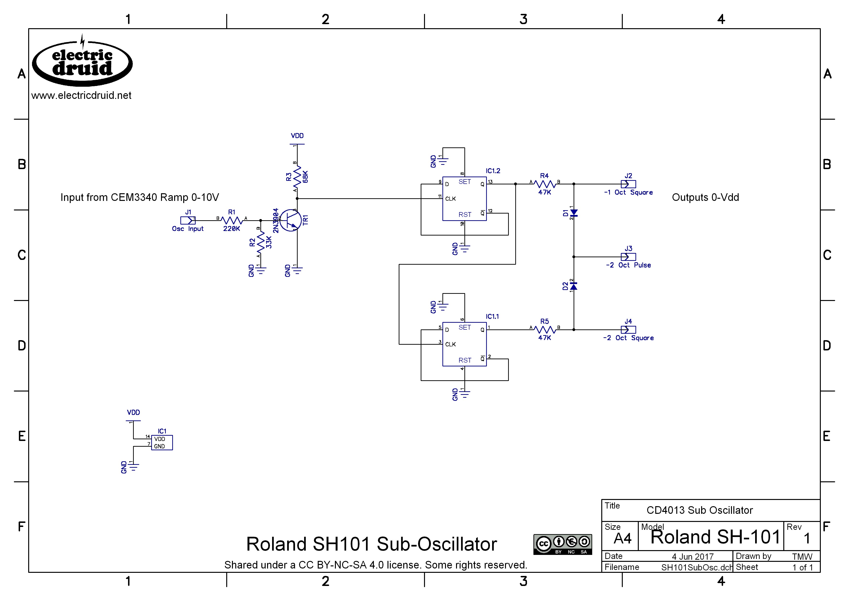 Note that the original Vdd in the SH101 was +14V, but CD4013 isn’t fussy and it’ll work pretty much anywhere from +5V to +20V.