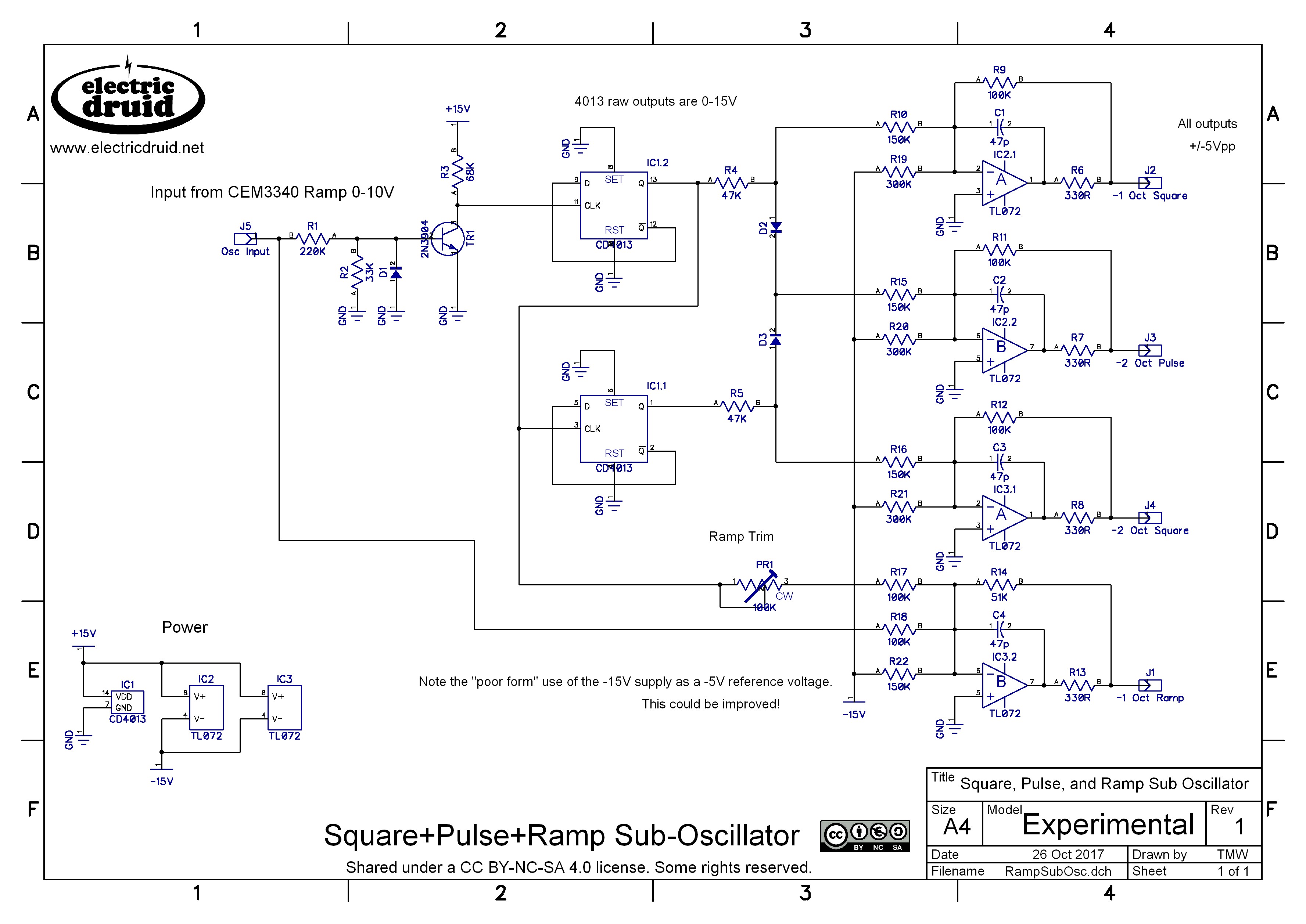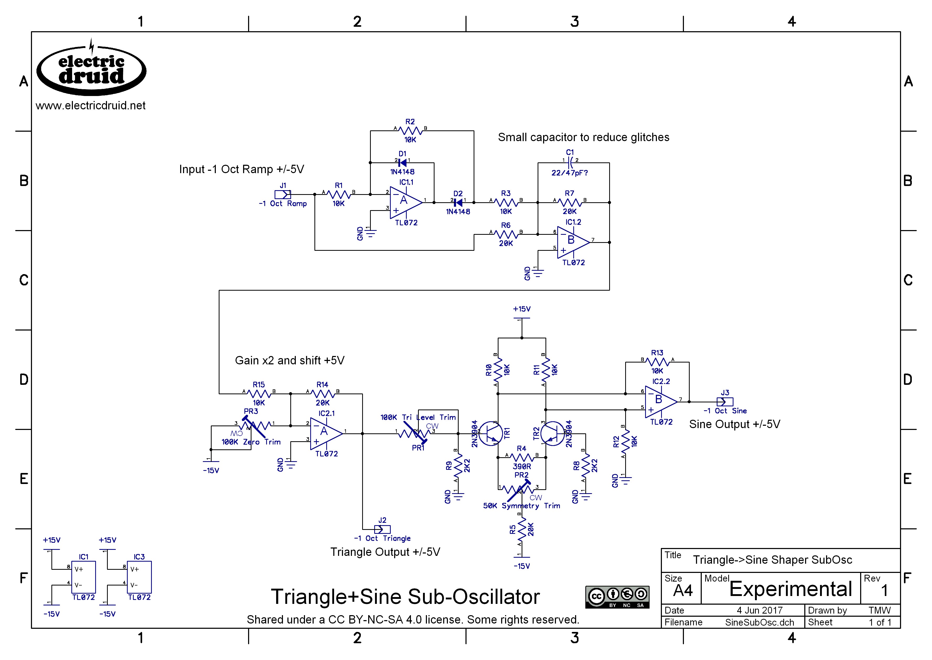 We’ve seen how to produce sub-octave square waves, pulses, ramps, triangles, and sines. Of course, these circuits can be combined and mixed and matched however you like. You can combine a sub-octave ramp generator with a comparator to give you a sub-octave pulse with pulse width modulation, for example. You could do the same with a sub-octave triangle too. There are lots of options, and the limit is really only the amount of circuitry you’re willing to consider as “reasonable”. It wouldn’t be too hard to combine the Square+Pulse+Ramp circuit with the Triangle+Sine circuit to build a sub-oscillator with a full set of waveforms (Ramp, Square/pulse, triangle and sine) at -1 or -2 octaves. While it wouldn’t be hard, it would use a lot of parts, and this is mostly why you typically see simpler designs in commercial synth circuits.