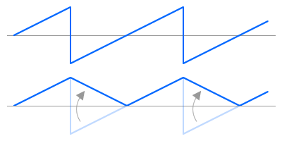 Another way to achieve the same effect is to start with a bipolar sub-octave ramp wave like we’ve seen above, and use a precision full-wave rectifier to rectify it. The rectifier “folds the lower half of the waveform over” and leaves it at the top. It looks like this: