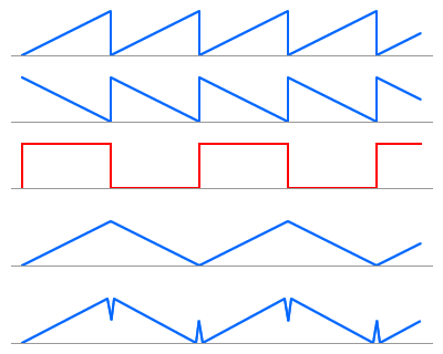 The top two lines shown the ramp and the inverted ramp, both in blue. The third line is the sub-octave square wave switching signal. The fourth line is what we get if we select the first ramp when the square is high, and the second (inverted) ramp when the square is low.