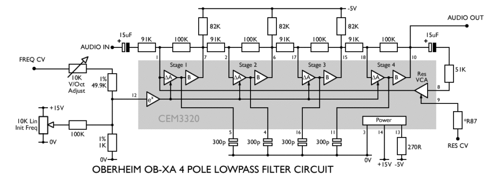 Like my SSM2044 page, this page is a look at how various synths implemented the CEM3320 filter, with the datasheet design as a reference standard. Whereas the SSM2044 is a dedicated lowpass filter, the CEM3320 is just a set of filter building blocks. In this respect, it is more like the earlier SSM2040. The CEM equivalent of the SSM2044 is probably the CEM3328, which is basically the same as the 3320, but wired up as a dedicated lowpass filter, thereby saving a few pins.