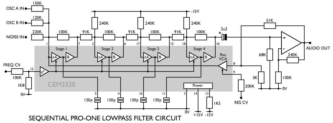 The Sequential Pro-One uses the filter in a circuit which is quite close to the datasheet. They’ve added a buffer op-amp on the output, which also affects the resonance path. They also use the virtual ground node at Pin 1 to sum signals from the two oscillators and the noise source. The filter capacitors have also been halved in value, which is going to raise the basic cutoff frequency of the filter by an octave.