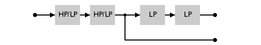 The idea of this was to provide a switchable response between 2 pole, 12dB/Oct lowpass and 4 pole, 24dB/Oct lowpass. There is one filter for each response, and you can switch between the two.