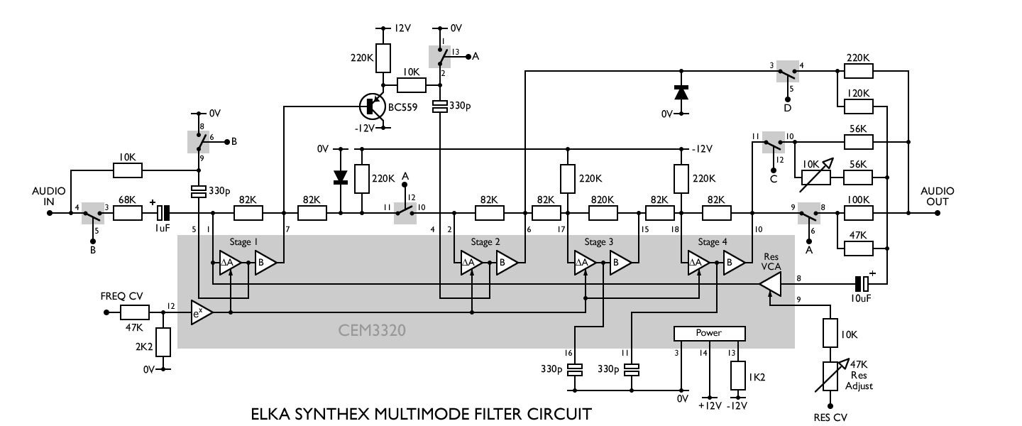 The Elka Synthex has probably the most sophisticated filter circuit built on the CEM3320 to ever have been used commercially. It uses analogue switches to reconfigure the circuit and provide a variety of responses. The Oberheim OB-8 that followed the OB-Xa did something similar, but only provided the 12dB and 24dB lowpass reponses that the OB-Xa had.