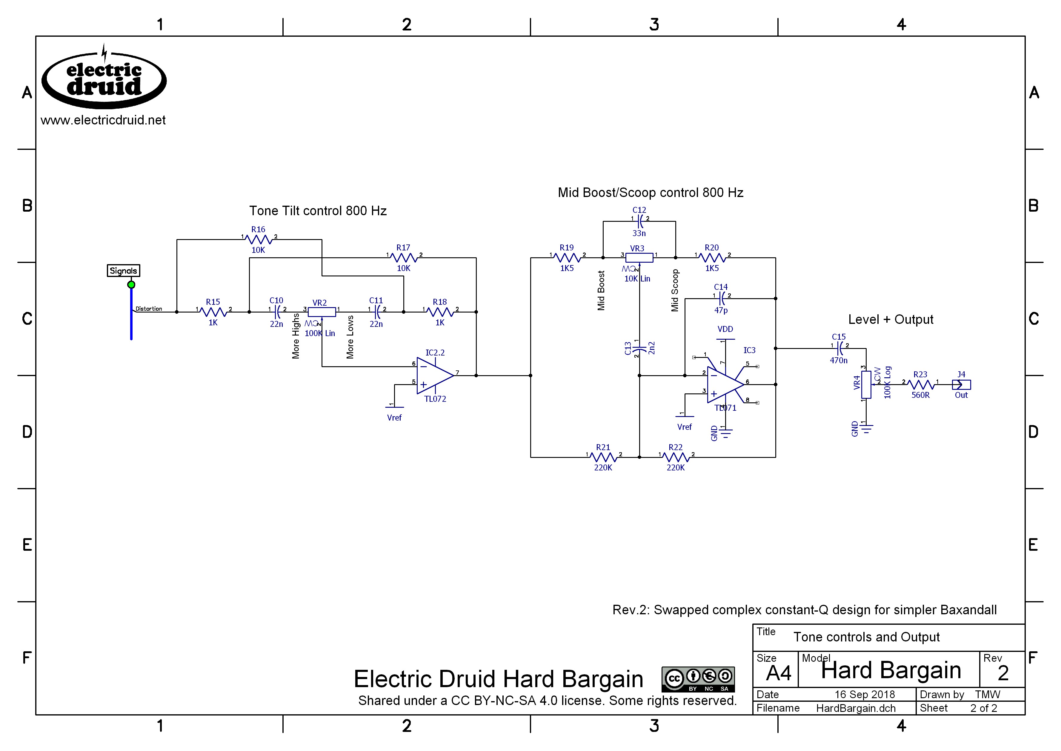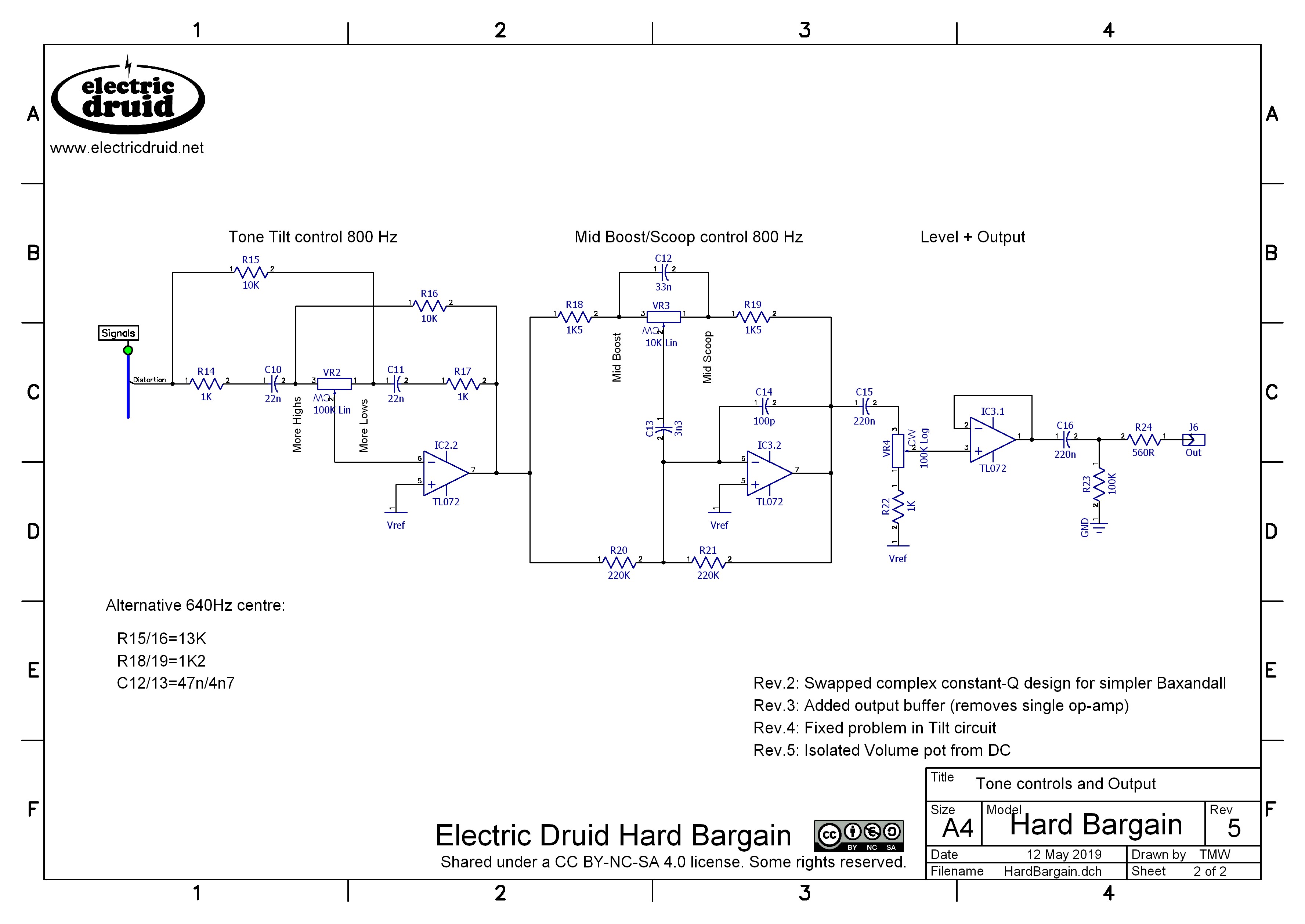 This updated version simply uses the extra op-amp as an output buffer after the volume control. This prevents the volume control from interacting with subsequent circuits and provides a solid, low impedance drive to anything that comes after it. It means the circuit uses three identical chips so you can put them in in any order and it’s all fine. I used TL072, but any common dual audio op-amp is fine, as long as it doesn’t lock up. Rev.5 was a final tweak to add a capacitor between the Mid control and the output buffer to prevent any DC offsets from making the volume pot scratchy. This is the final version.