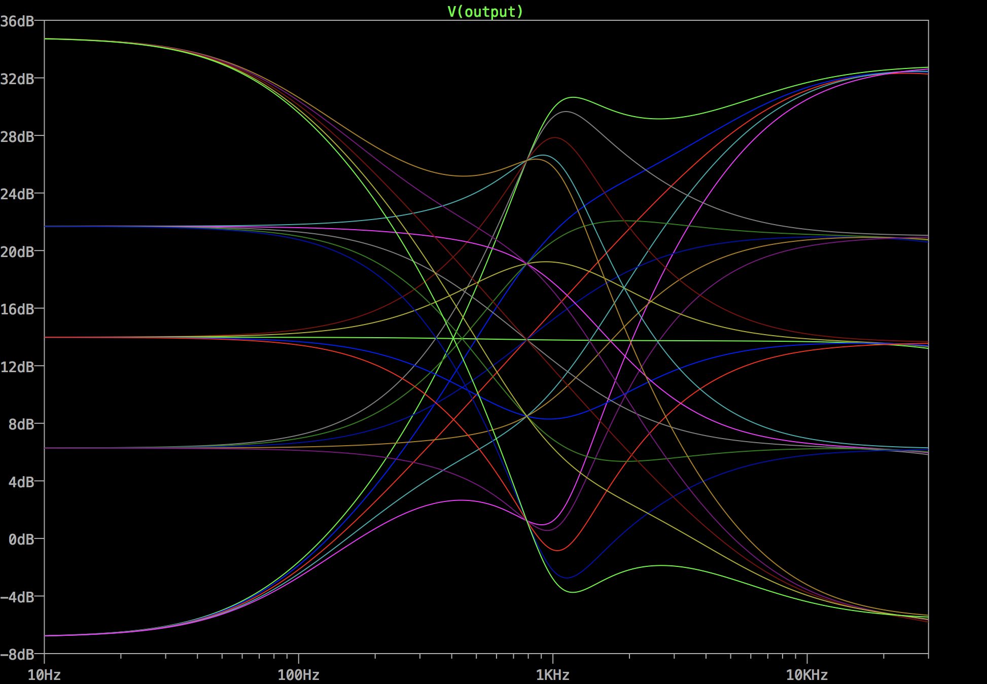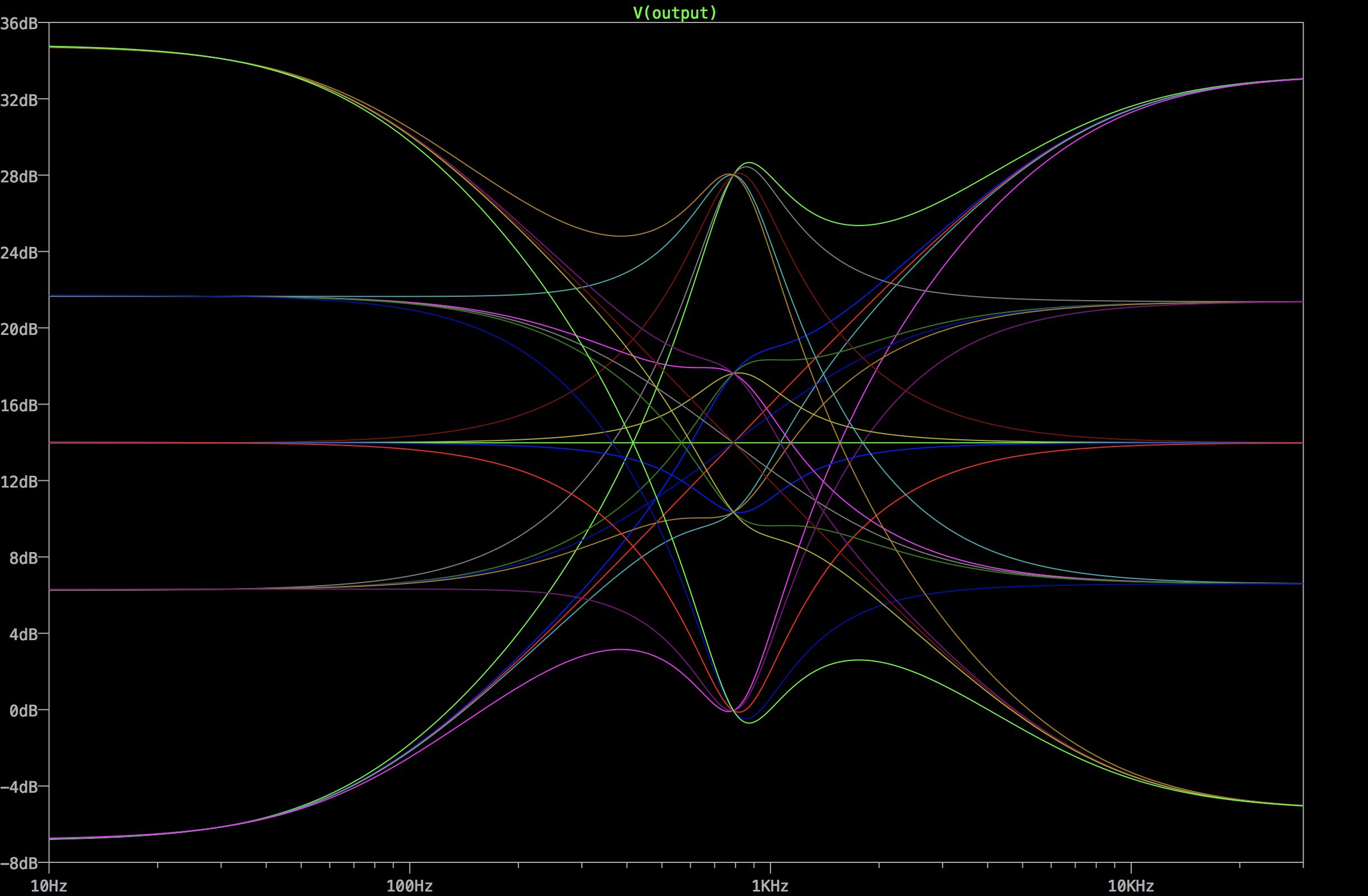 This gave me a working tone controls, but there’s still a lot wrong with it. It’s far too complicated for a start. Five op-amps just for two knobs? That’s pretty wasteful! However, the response graphs I was getting looked good, so I thought I was on the right lines: