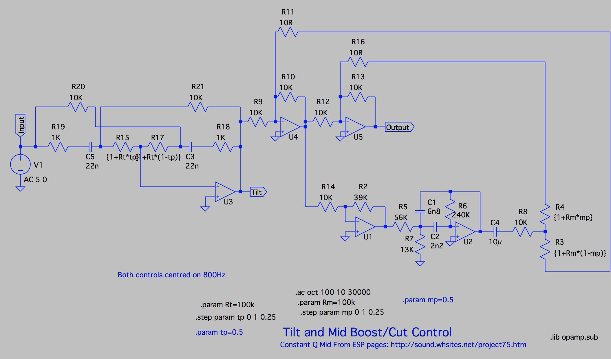 Ok, so I’d established the general concept. Now I needed circuits to implement it. I vaguely remembered something about a rarely-used tone control known as a “Tilt” control which offered the sort of Bass/Treble balance I was looking for. This is pretty much an active version of what the Big Muff tone control does. The only reference I could find was on the Elliott Sound Products (ESP) audio pages. The circuit looks like this: