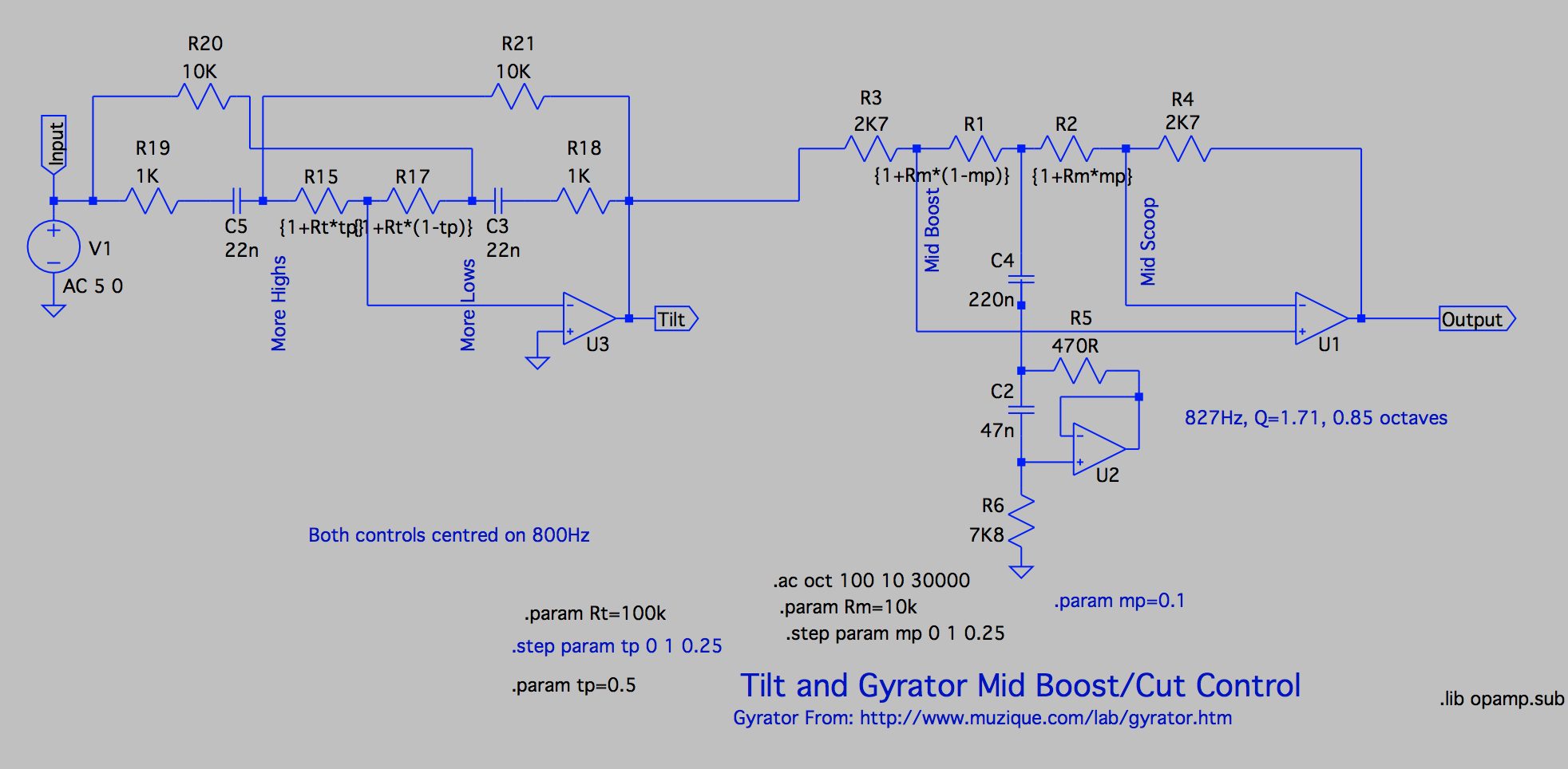 However, that’s not what I did. I just built the circuit in the LTspice simulator, and then tweaked values to get what I wanted. It’s easy to plot frequency responses from the sim (all the graphs in the article are done like that) so you see straight away what you’ve got. This gives you a good understanding of “what each bit does”.