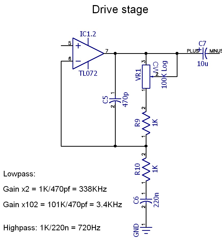 What’s more tricky than the gain is the frequency response of this stage. C6 acts as a highpass filter and rolls off the bass below its cutoff frequency. In this circuit I chose the TubeScreamer value of 720Hz to avoid muddy bass notes. Similarly C5 rolls off the treble, and interacts with the gain control with more treble being lost at higher gain. Since higher gains tend to produce more distortion and harmonics, this “compensation” effect is quite useful. With the given value, at minimum gain the capacitor has no effect except on ultrasonic frequencies of several hundred kilohertz. As the gain is increasing the cut-off frequency moves down until it reaches 3.4KHz at maximum gain. This is low enough to smooth the op-amp clipping a little at the extreme and to prevent too much treble reaching the next stage.