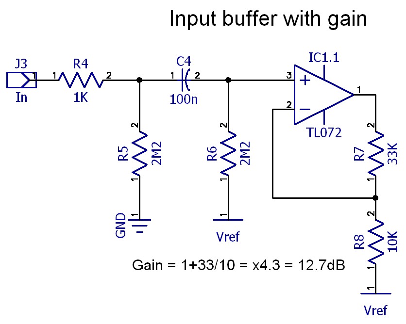 Since this was not the only gain I was going to put in the circuit, there was no need to go crazy, so I picked a couple of conventional values (10K and 33K) and had a look what I got. For the non-inverting op-amp arrangement, that gave a gain of (33/10)+1 =  x4.3, +12.7dB. That’s a reasonable boost for starters, and acts as the foundation of our sound. It also gives us a bit more level to work with so that we don’t have to provide massive gain in our distortion stage, which tends to get a bit noisy. If you wanted a bit more boost, swapping the 33K for 47K would be a simple change to make.