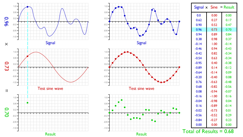 The first step is the multiplication of a signal sample with the corresponding test sine wave sample. This is shown on the left (0.96 x 0.73 = 0.70). I used the fourth sample rather than the first for the example, because the first sample is zero.