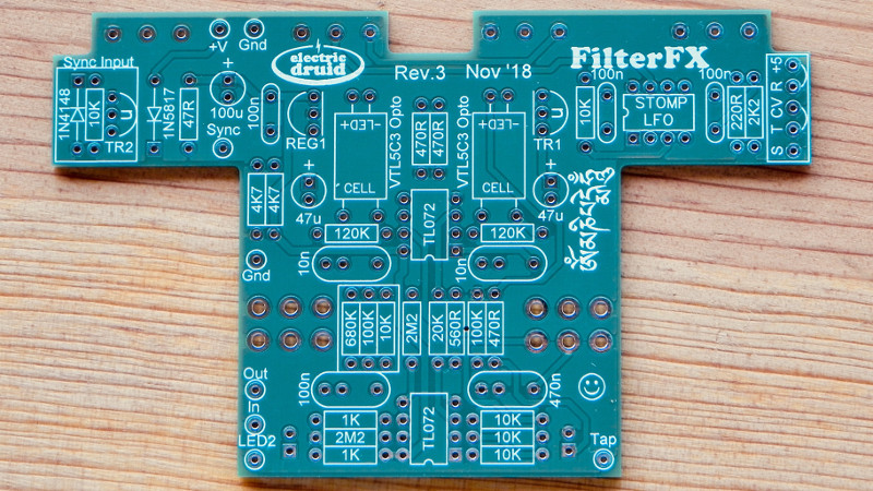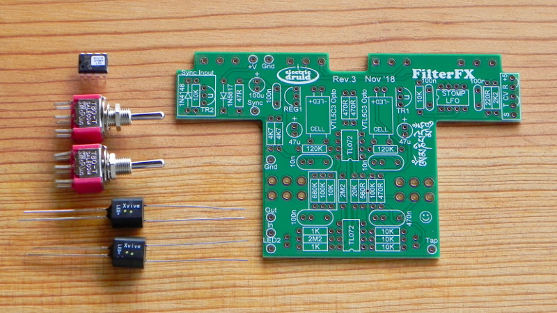 FilterFX PCB, complete with two Xvive VTL5C3 vactrols, two Salecom T812 three-position (On-On-On) DPDT switches, and a Druid STOMPLFO chip. This PCB+parts set is all the more-difficult-to-obtain parts. You might also want the FilterFX pot set which includes four of the right-angle PCB mounting 10K Lin potentiometers which make the build very easy.