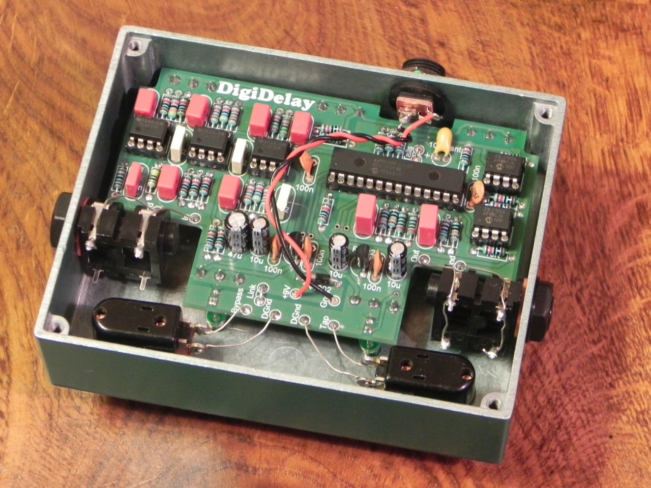 The PCB is FR4 fibreglass for strength, with plated through-holes and green soldermask and white screen print on both sides. The PCB layout can accept film capacitors with either 5mm/0.2″ or 7.5mm/0.3″ lead spacing, so you’re not limited in your choice of capacitors.