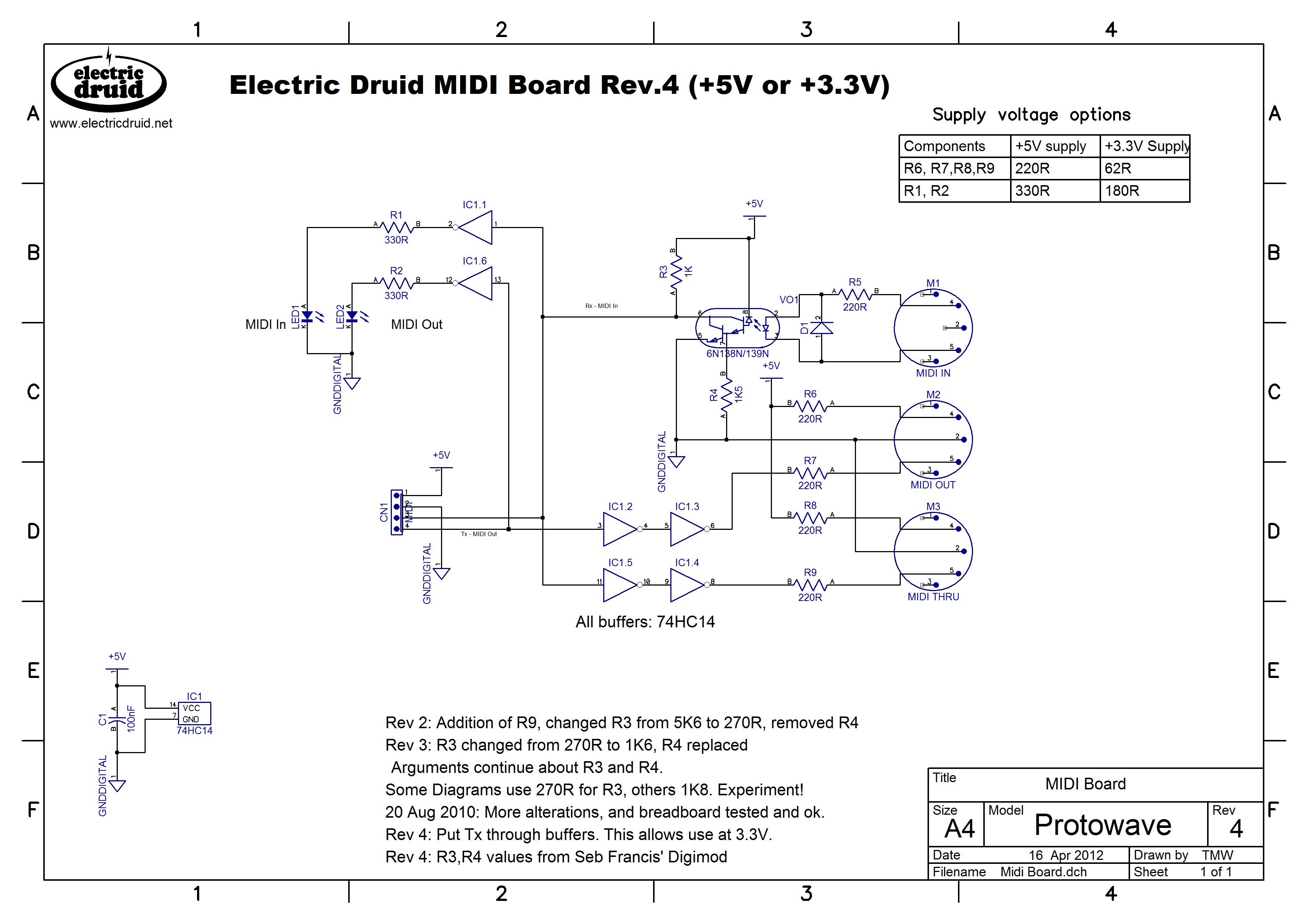 The board can be populated with different component values for either +5V or +3.3V operation. The required component values are shown on the Electric Druid MIDI PCB schematic diagram.