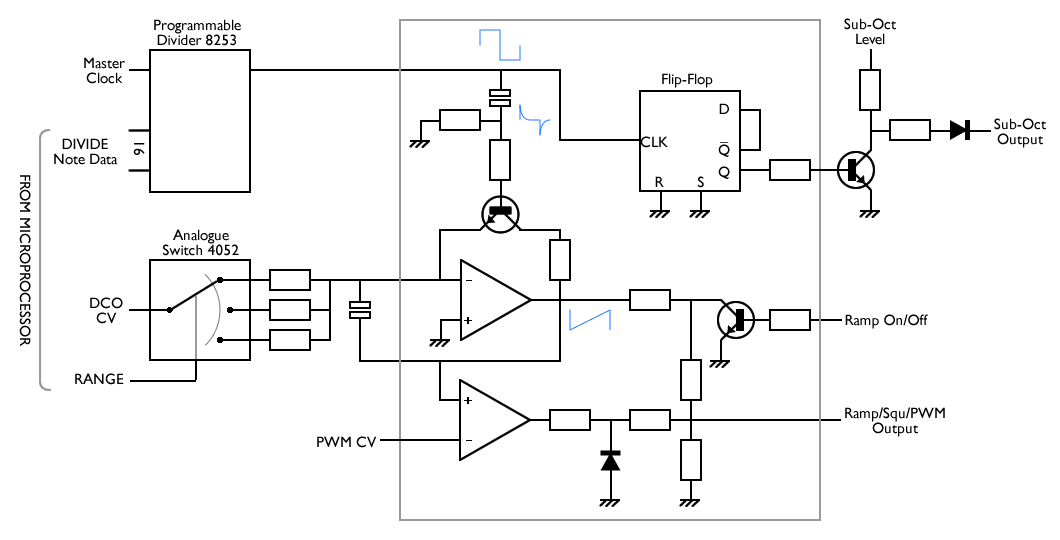 The Roland DCO is an interesting hybrid design. Although digitally controlled and digitally stable, the oscillator produces a true analogue output, even for ramp waves, rather than the typical staircase waveform produced by feeding an incrementing count to a DAC or from a wavetable.